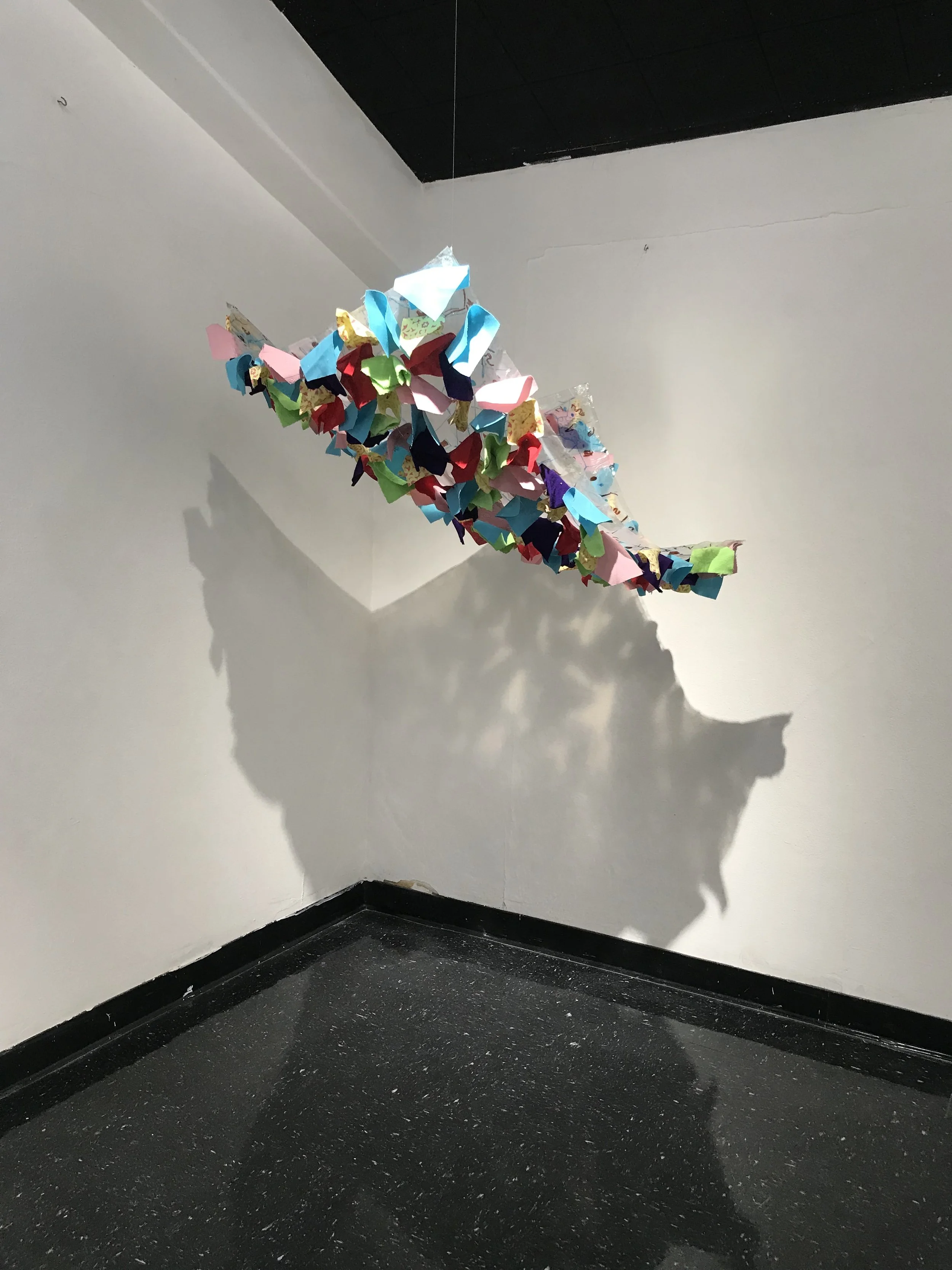 Mixed Media: sharpie, fabric cutouts, painters tarp, sewing pins, fishing line